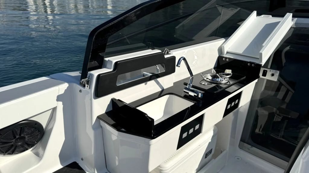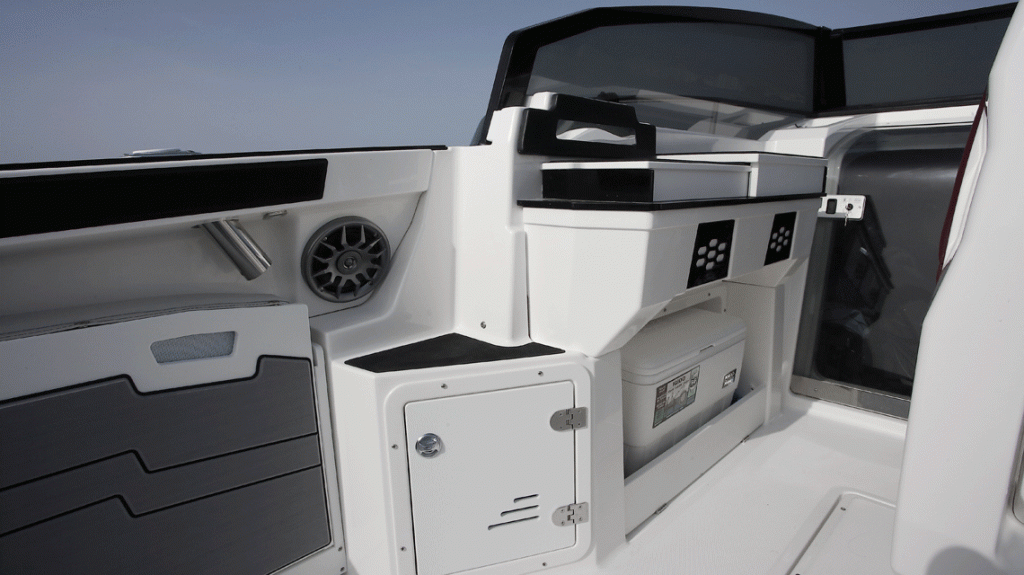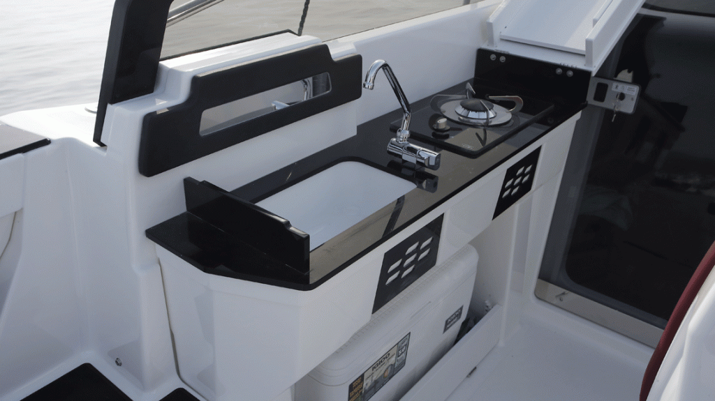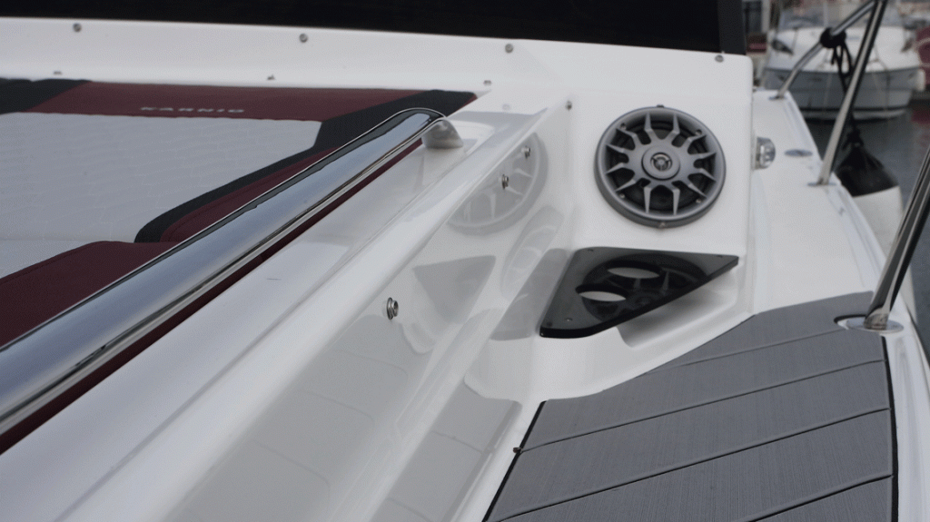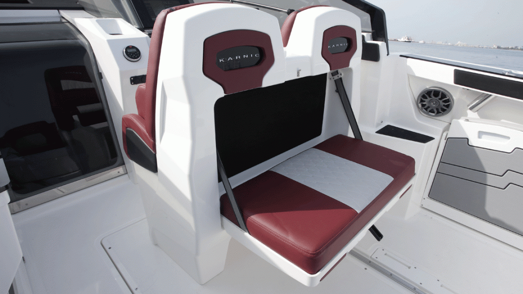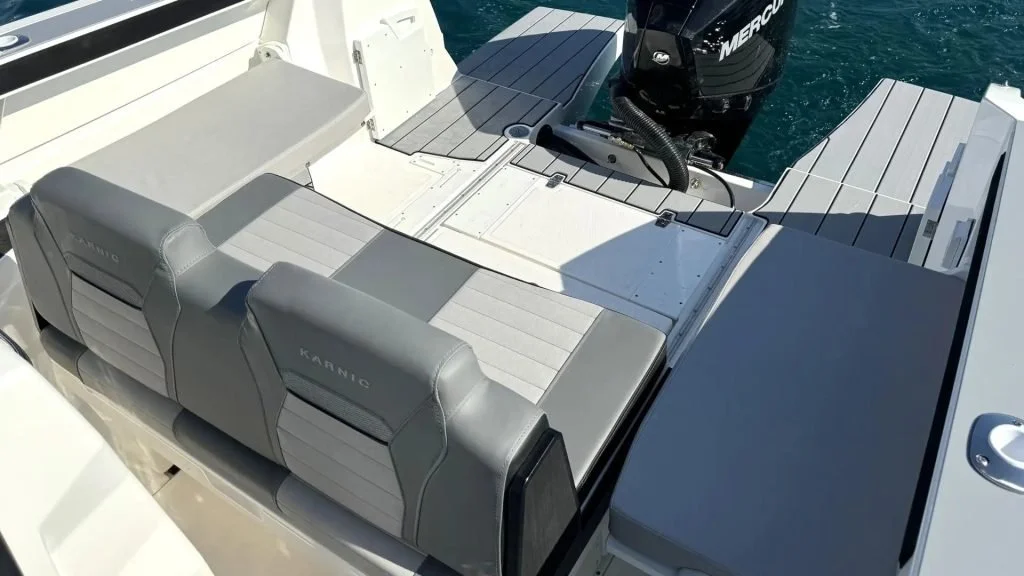 The interior of the Karnic CS740 impresses with a spacious cabin, where we find comfortable seats, a berth and elegant details that ensure a pleasant stay on the water. The cockpit allows for various seat configurations that can be rearranged according to needs - whether for socializing, dining or sunbathing. There is also a great emphasis on practical solutions for storing equipment.