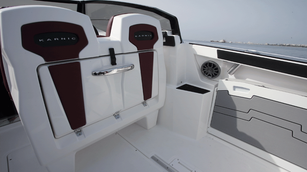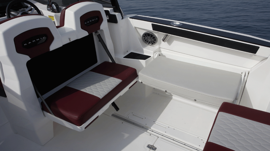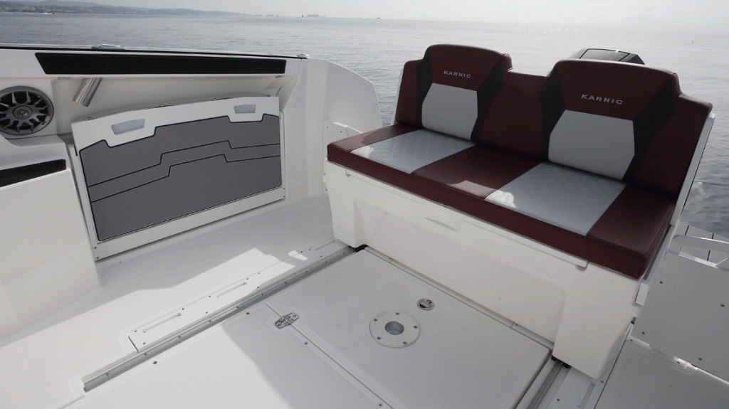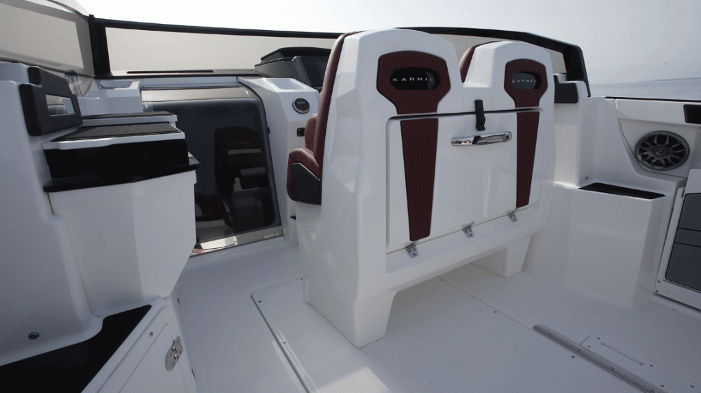 The interior of the Karnic CS740HT offers a cabin with a spacious berth, the possibility of a kitchenette and numerous practical solutions for storing equipment. The cockpit is designed to allow for various seating configurations that can be rearranged for socializing, dining or sunbathing. The T-top roof provides protection from the sun and creates a feeling of openness and freedom while sailing.