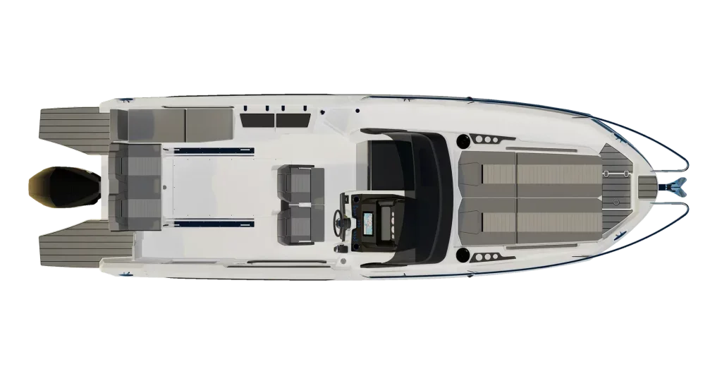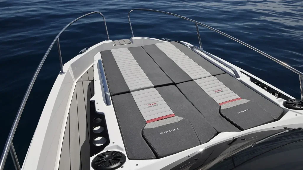 The Karnic R8 model impresses with its modern hull shape and smart design of the space on board. The cockpit allows for various seating configurations that can be adapted to your needs - from comfortable socializing around the table to a large sun platform for relaxation. A special feature of the model is the stepped hull, which contributes to greater speed, more efficient planing and navigation stability even at higher speeds.