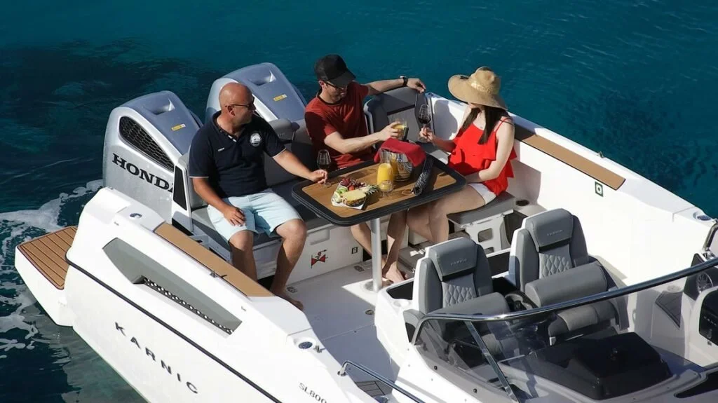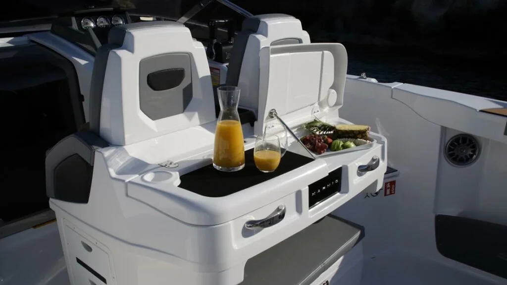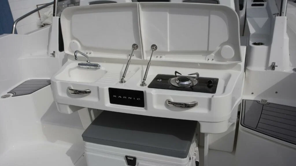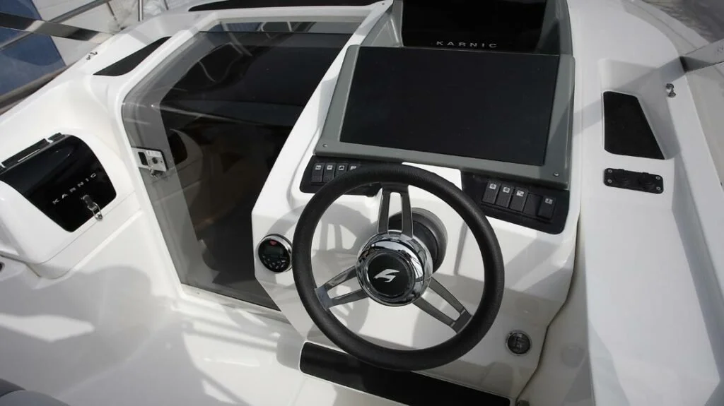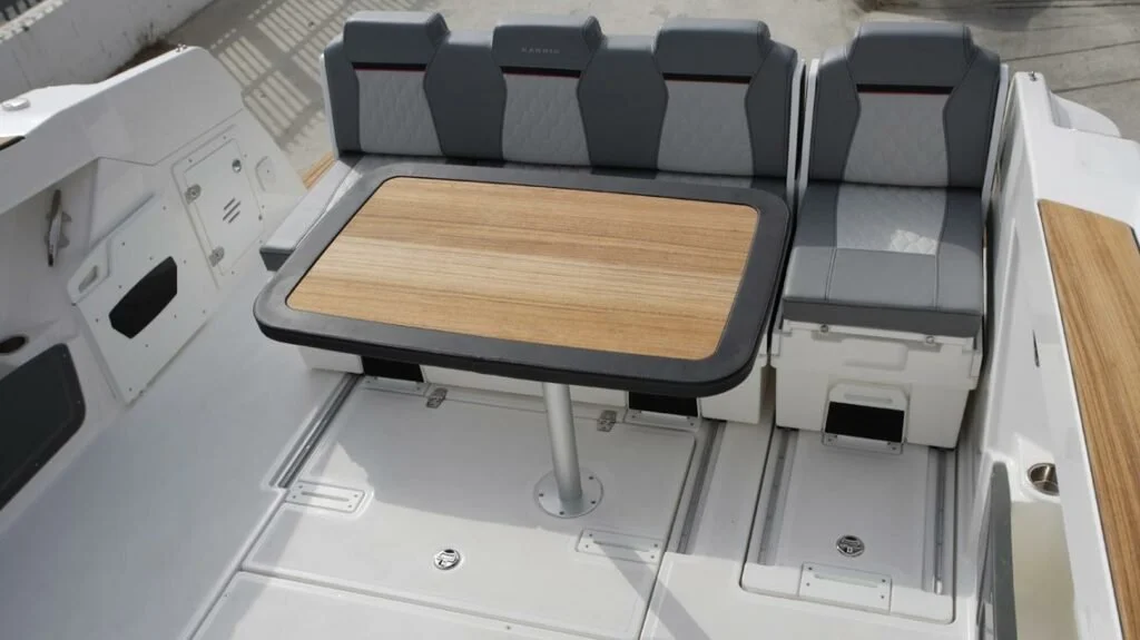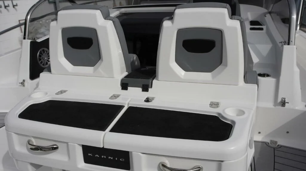 The interior of the Karnic SL902 offers a spacious cabin with a comfortable berth, the possibility of a kitchen area and numerous storage solutions. The cockpit is designed for maximum flexibility, the seating can be rearranged into various configurations - from comfortable socializing at the table to a large sun platform for relaxation. This flexibility allows for optimal use of the boat for both family trips and sports adventures.